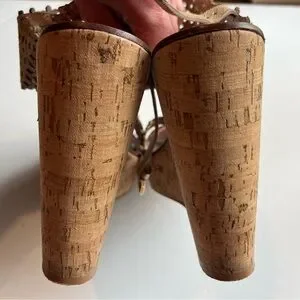 Laser cut daisy pattern, cork wedge heel, buckled ankle strap, golden hardware. Leather upper, leather lining. Adjustable ankle strap with buckle closure. Very chic and stylish!