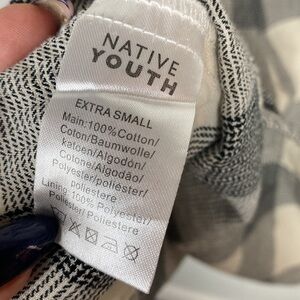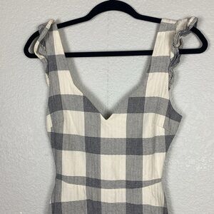 Native Youth dress. solid cream with black grid pattern detail. tie back detail. ruffle sleeve sleeveless. additional photos and measurements available upon request.