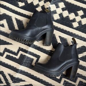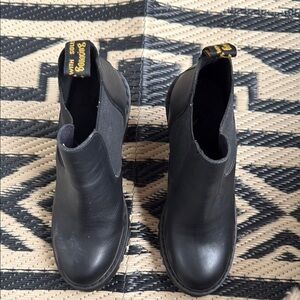 Experience the perfect blend of style and comfort with these Dr. Martens black heeled Chelsea boots. Featuring a smooth leather upper and a chunky block heel, these boots offer a classic look with modern flair. The elastic side panels ensure easy slip-on wear, making them a versatile addition to any wardrobe.