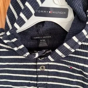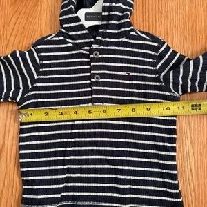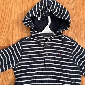 ADORABLE Tommy Hilfiger Baby Boy 2 Piece Outfit Set!!! Blue & White Stripe Hoodie Has 2 Buttons & Tommy Hilfiger Logo On The Left Side Of Chest. Gray Sweatpants Have "Hilfiger" On Left Leg & Drawstring Detail!