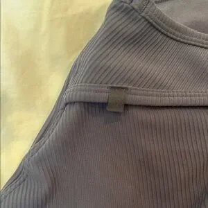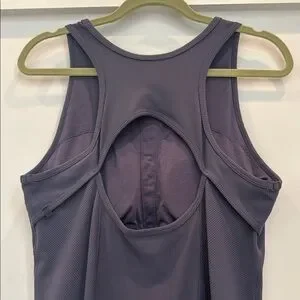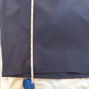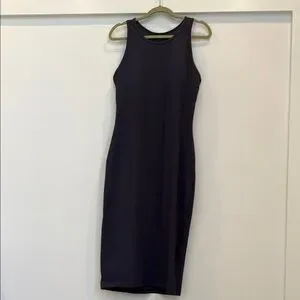 Form fitting sleeveless stretchy midi dress. Built in shelf bra with padding. High neck. Back cut-out. Ribbed material. Stone blue. 17 inches pit to pit, 42 inches long