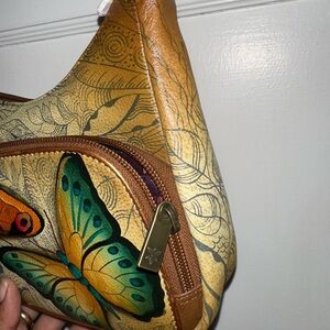 This exquisite leather shoulder bag features vibrant hand-painted butterfly designs. The rich brown leather adds a touch of elegance, making it perfect for any occasion. Never worn only stored