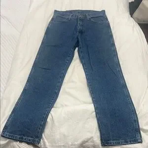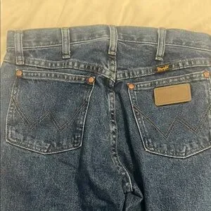 Classic Wrangler Cowboy Cut blue jeans in dark stone wash. Durable and stylish, these jeans are a must-have in your wardrobe to pull off your cowboy-sheek look. Worn nice. Size: Men’s 29x32