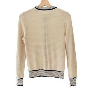 Vintage Retro Cream Ivory Tone Button Down Cardigan with Navy Blue Striped Accents