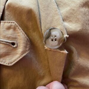 Repairs needed: Missing belt. On the back bottom of the trench there is a horizontal tear at the button. Please see pictures.