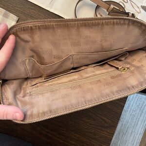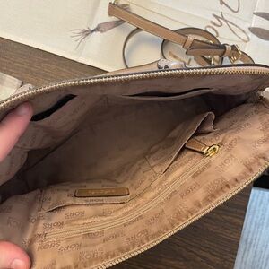 This is a cute bag from Michael Kors. It is the Cindy Dome Leather Satchel. The color is a light rose gold, almost beige. The leather is in great condition with minor marks, as shown in the photos. It comes with a crossbody strap that can be attached to the metal part of the shoulder straps. The inside is in good condition but does show some use. Measurements can be provided upon request.
