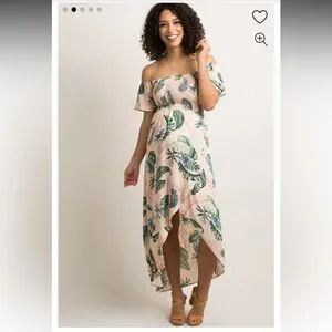 PinkBlush Peach Leaf Print Smocked Off Shoulder Maternity Dress