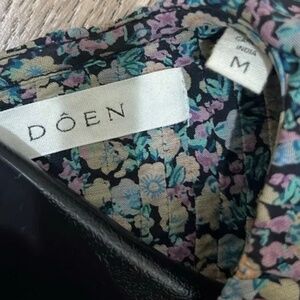 This sophisticated black blouse by Doen showcases a charming ruffled Peter Pan collar, offering a vintage-inspired elegance. The long sleeves and flowing silhouette ensure a comfortable and stylish fit, making it a versatile addition to any wardrobe. Its timeless design is perfect for both casual and formal occasions.