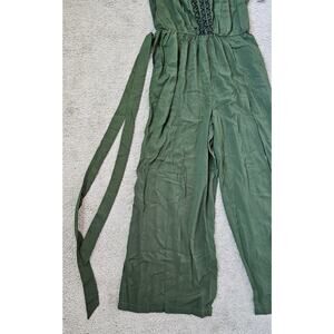 This beautiful jumpsuit from Old Navy is perfect for any occasion, whether you're heading to a wedding or just running errands. The olive green color and boho accents, such as the tasseled belt and embroidered details, make it a stylish addition to your wardrobe. The wide-leg design and relaxed fit ensure your comfort, while the low V back adds a touch of sexiness. This jumpsuit is a must-have for any fashionable woman's wardrobe.