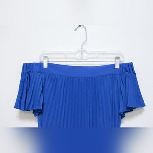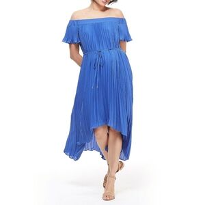 Maggy London Size 10 Blue Pleated Off The Shoulder High-Low Midi Dress A-Line