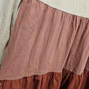 Stylish cotton color block dresses, with a collared neckline, elastic wrists, tiered color block skirt, and woven Simply Southern label on the bottom right
