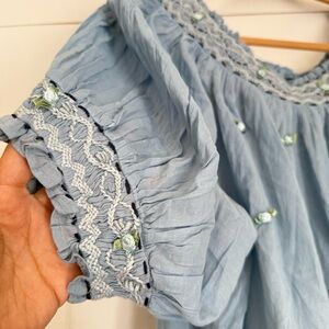 Features: Semi-sheer cotton fabrication, scoop-neckline, contrast embroidery, puffy short-sleeves with elasticated cuffs, gathered detail for added dimension