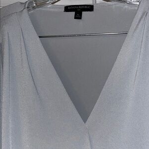 This Banana Republic blouse features a sophisticated wrap design in a soft gray hue, offering a chic and versatile addition to your wardrobe. The full-length sleeves and draping fabric provide a comfortable fit, making it perfect for both casual and formal occasions.