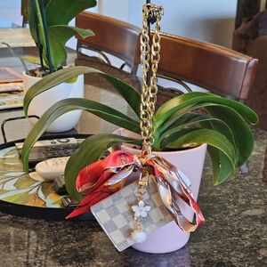 This stylish keychain wallet features a chic gold chain and a cream patterned design. Perfect for keeping your essentials secure and accessible.