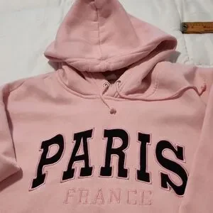Stlish pink hoodie with 'Paris France' text. Comfortable and trendy.