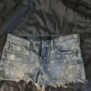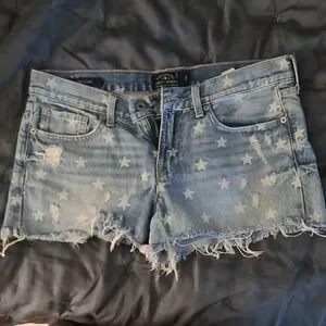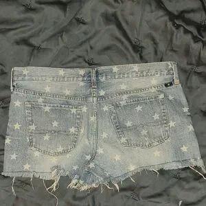 Trendy denim shorts with a star pattern. Features a frayed hem for a casual look.