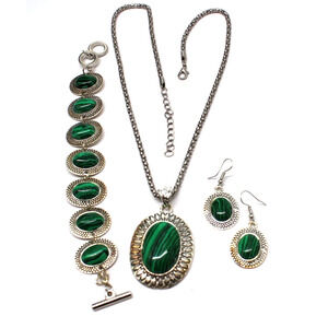 Green and silvertone faux Malachite pendant, bracelet and earring set.