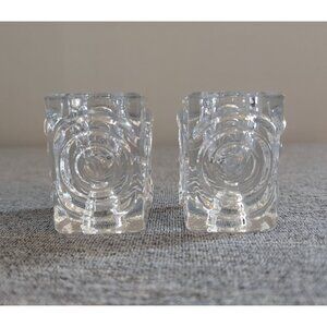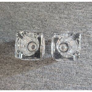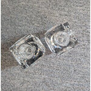 Pair of Riihimäki / Riihimäen "Rengas" Reversible Glass Candle Holders. Both in very good used condition; both have light scratch marks/shelf wear from previous use, one has some blunting on one edge and an inclusion in the glass (see photos for all). No damage or defects noted otherwise. Each measures 2" long/wide, 2.5" tall; the candle holes are 1 1/8" diameter on one side, 1 7/8" diameter on the other.