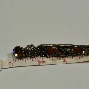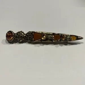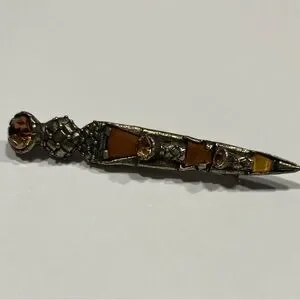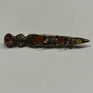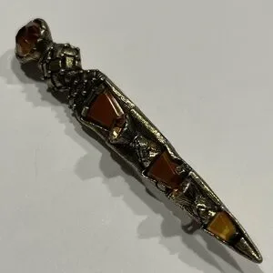 A beautiful vintage Scottish brooch in the shape of a dagger studded with faux citrine and Scottish agate colored glass/stones. Light gold tone metal. Beautiful detail work of braided and thistle style designs. Glass gems are bright and sparkly and catch the light beautifully.