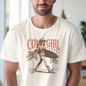 COWGIRL SUMMER graphic tee with a cowgirl carrying a surfboard, palm trees.