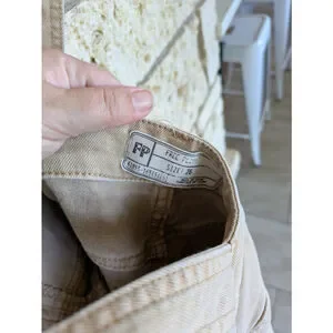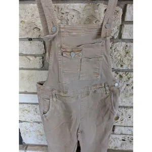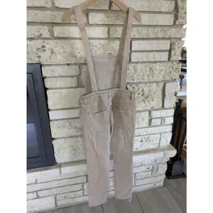 These are pre-owned Free People brand overalls, size 26. They are a light tan color and appear to be made of denim. The overalls feature adjustable straps with metal button closures, a front bib pocket, and standard jean-style pockets on the front and back. There are belt loops around the waist.