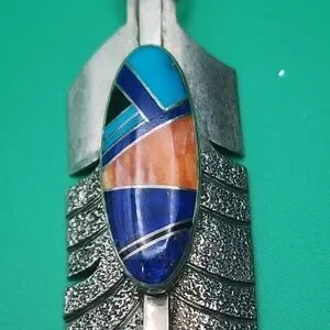 Stunning .925 sterling silver feather pendant featuring a vibrant multi-gemstone inlay featuring turquoise, onyx, spiny oyster, and lapis lazuli. Perfect for adding a touch of color to any outfit.