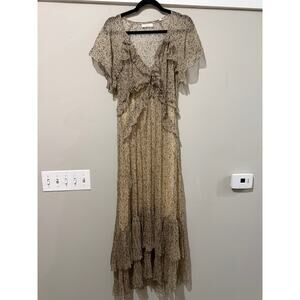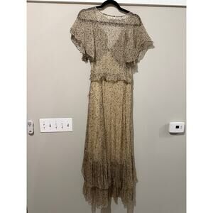 Doen Antoinette Maxi Dress in Chamomile Garden Bloom. Size L / Large. Features subtle paisley floral print, short flutter sleeves, ruffled tie front bodice, v-neck, tiered skirt, pulls over, side zipper closure, long maxi length, semi sheer fabric overlay, partially lined. 100% silk, Great used condition, no notable flaws.