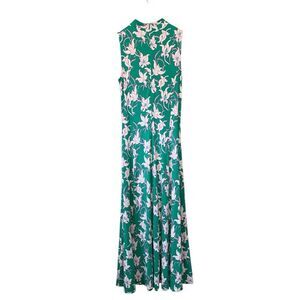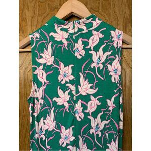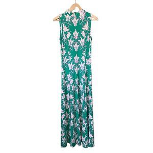 This ME+EM dress is a sleeveless, high-neck maxi dress in a vibrant green hue with an elegant floral print featuring cream-colored flowers with subtle pink accents.