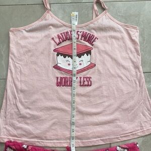 Cute light pink tank with adjustable straps “Laugh S’More Worry Less” with cute s’more face.