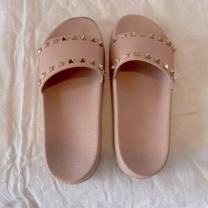 - Rubber slip on sandal in light pink. - Anatomically shaped rubber insole. - Open round toe. - Signature pyramid pale gold studs at strap. - Rubber sole with camouflage sole design. - Made in Italy. - 100% authentic. - Worn a handful of times and some light scratching / scuff on front right . still alot of life left
