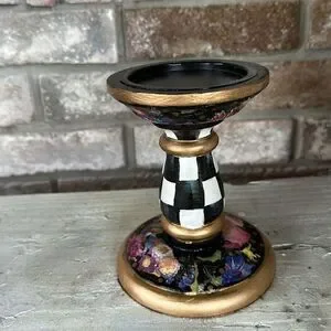 The pair measure 9” and 6” tall. Designer inspired, whimsically painted in polka dots, checks , stripes and accented with Mackenzie Childs Flower market decoupage. This price is for the pair. They can be purchased individually. Check my listings under Home