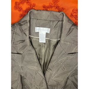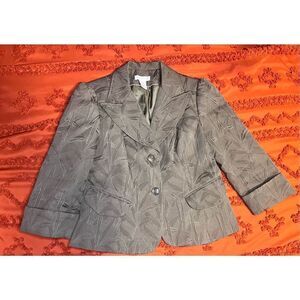 Worthington jacket/blazer. Size 12. Shell exterior 57% polyester. 43% cotton. Lining 100% polyester. Made in Vietnam. This jacket has two pockets in the front, cuffs on the sleeves. Thick collar, lapels big green buttons. Shoulder pads embossed with stem flowers. Green shiny stitching. What a Time piece! No snags no rips.  No stains. Beautiful jacket.