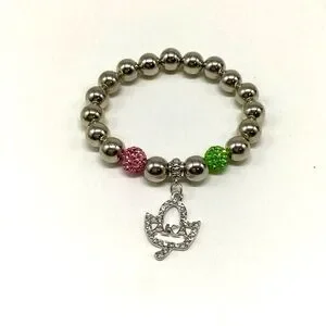 Elegant silver bracelet featuring pink and green rhinestone beads with a stylish crystal AKA charm. Perfect for adding a touch of bling to your outfit.