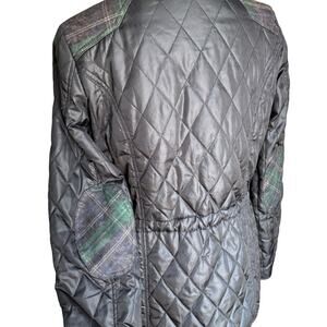 Diamond-quilted jacket featuring snap-through patch pockets and plaid at shoulders, elbow patches, and inner collar