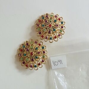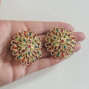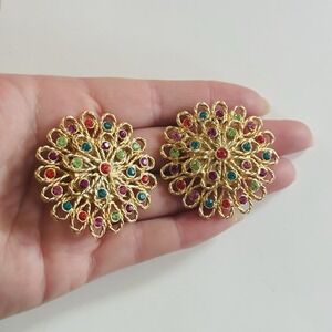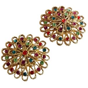 Tara Signed Round Earrings VTG Gold Plated Clip chunky Crystal Statement Regal