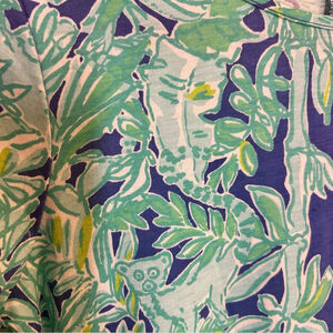 If you look at fabric it has a jungle theme animals with foliage. Blue greens. Aqua. Fine cotton knit . Light weight.