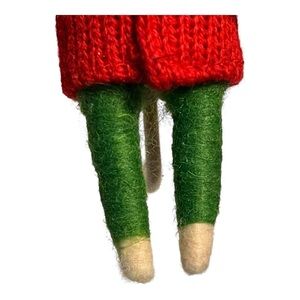 Vintage Christmas mouse white felt with red knit sweater. Arms wrapped in red yarn, legs wrapped in green yarn. Mouse is holding a milk jar has a long white tail. Excellent detail to this ornament. Great preowned condition. Mouse stands right at 5 inches tall. Great item for your Christmas collection. #Christmas #Mouse #Felt #Vintage #Yarn #Collectible#Whimsy #Kit