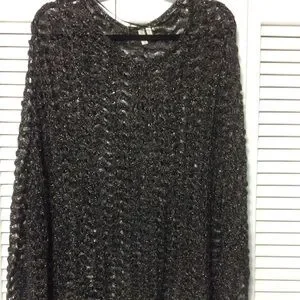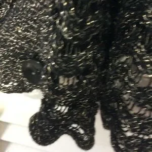 Ladies plus size poncho/cape. Silver lurex thread throughout and sizes are held together at the bottom with a large button. Plus-size one size fits all.