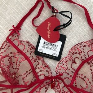Reclaim romance in heart lingerie. Inspired by bejewelled heart motifs of Parisian cabaret, this dripping jewel embroidery comes from prestigious Swiss design. Spoil yourself with the classic lingerie set and open-access thong, designed for layering with our heart-stopping bodysuit or the bedroom teddy. Pair with our new sweetheart stockings to make them swoon.