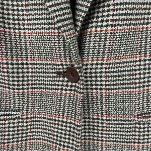 Stylish plaid blazer jacket with a classic design. Features a mix of black, white, and red colors.
