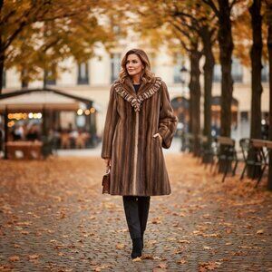 DESIGNER C H COUTURE HELENE BROWN FAUX MINK BEAUTIFUL COLLAR TWO SIDE POCKET FULLY LINED SWING COAT