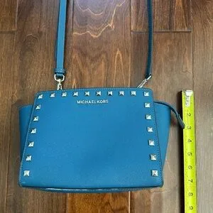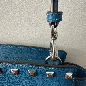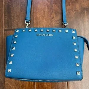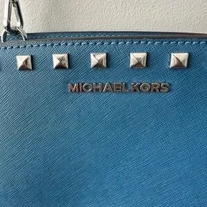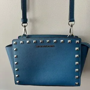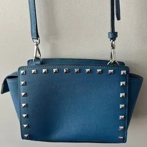 This Michael Kors crossbody bag showcases a vibrant blue color and a structured shape, enhanced by edgy silver-toned studded detailing. The adjustable strap adds versatility, making it a stylish and functional accessory for any occasion.