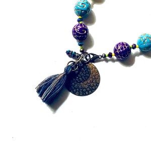 Materials of acrylic beads, tassels, glass Czechs, and iridescent fun. Brass lobster claw clasp clasp,
