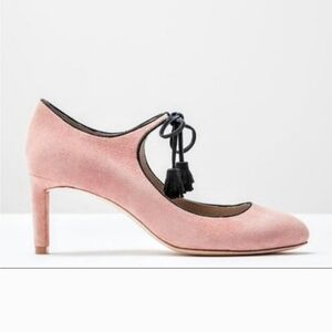 Adorable Boden, blush pink suede heels worn still has the labels on the bottom of the shoe with leather souls real leather Bowden size 39 Mary Jane style with a tassel bow has a two and three-quarter inch heel with a charcoal gray piping detail around the edge