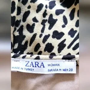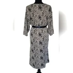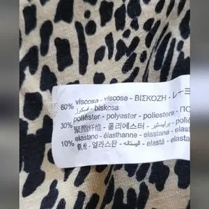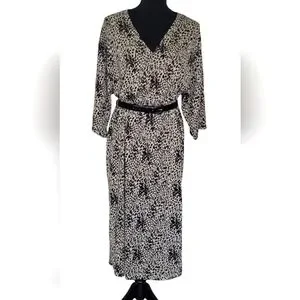 Animal print dress with a deep v-neckline. Short wide sleeves. String belt loops. Belt not included. Dress up or down. Great for casual days.