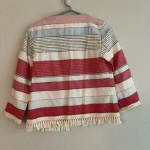 Red blue white striped cardigan sweater with fringe hem. Fake pockets.