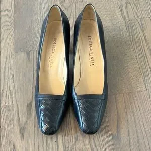 Step into sophistication with these Bottega Veneta black heels, crafted from luxurious textured leather. The square toe design adds a touch of vintage charm, while the low block heel ensures comfort and stability for any occasion.