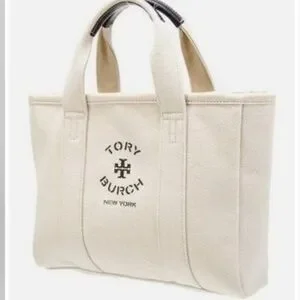 TORY BURCH Mini Mercer Natural Canvas Tote with two structured handles with black leather and black logo lettering.