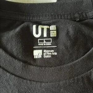 Black T-shirt featuring a vibrant Hokusai Colors graphic with a red mountain design. EUC
