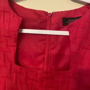 This stunning pink sheath dress by Tahari features a chic square neckline and elegant embellishments, perfect for cocktail parties or as a wedding guest. The sleeveless design and midi length add a touch of sophistication, making it a versatile addition to any wardrobe.